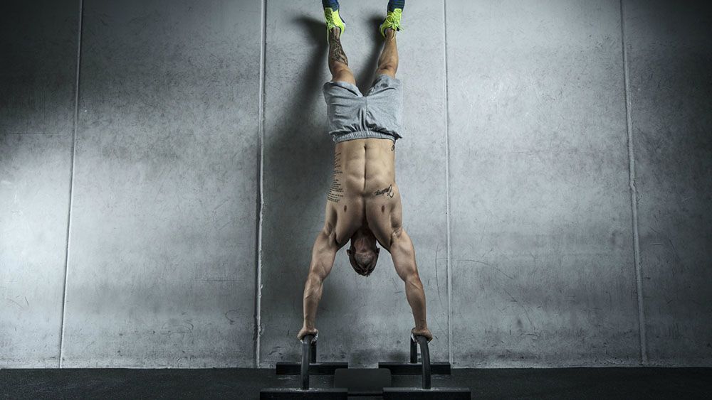 The technique of mastering the handrest is simple: sit on the floor with your back against the wall, lower your head down and feet in the vertical plane until you are in the right position.